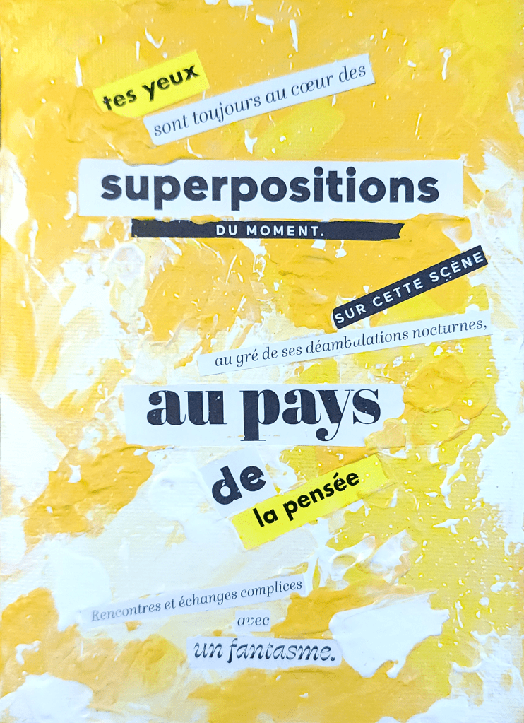 Depuis peu, le poème collé s’est ajouté aux cordes de mon arc. Je joue donc avec les mots, lorsque l’envie de m’imaginer poète me prend.